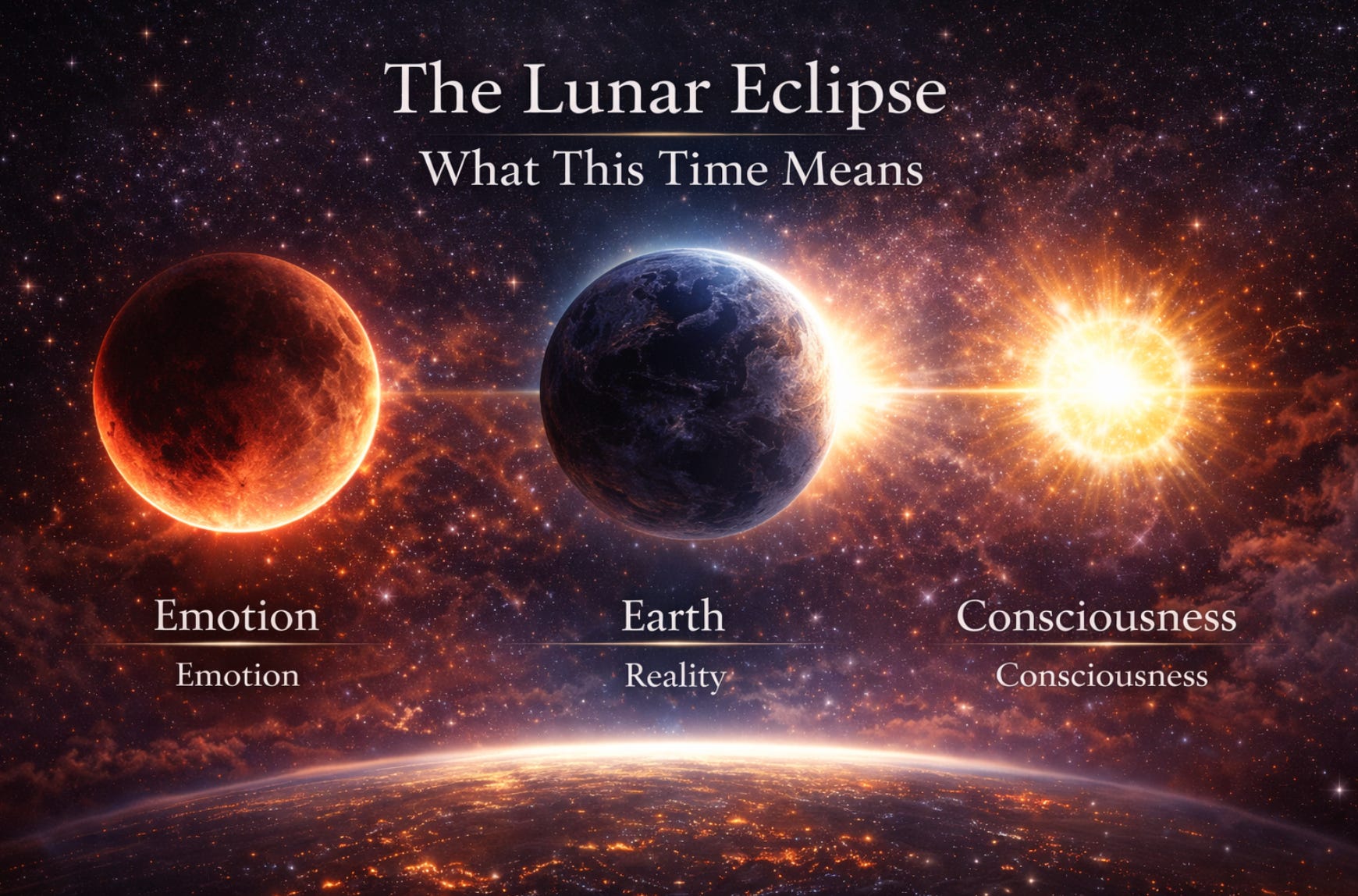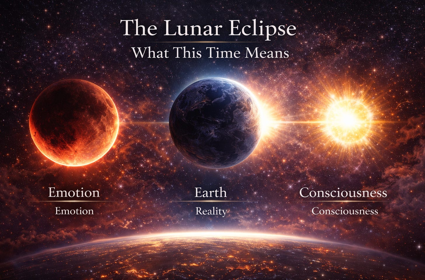 Astronomically, the Sun, Earth, and Moon align—and the Earth casts its shadow over the Moon. But symbolically? The emotional body (the Moon) is filtered through reality (the Earth) while illuminated by consciousness (the Sun).